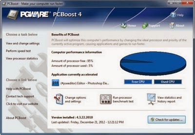 PcBoost é um programa que permite rodar programas muito mais rápido que o programador original pretendia. Com pouco ou nenhum esforço você pode facilmente fazer programas e jogos correr mais rápido no seu computador sem ter que comprar um PC novo. Muitos programas e jogos costumam usar uma quantidade mínima de energia da CPU que muitas vezes leva a CPU ficar ocioso e realmente não uso muito em tudo. PcBoost aproveita esta alocando mais poder de CPU para o programa ativo / jogo.